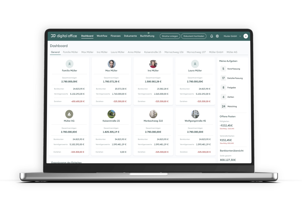 digital office bietet Ihnen und Ihrer Familie die Möglichkeit, Ihr Gesamtvermögen an einem zentralen Ort zu sammeln und intuitiv zu steuern. Mit definierbaren Zugriffsrechten unterstützen wir eine effiziente Zusammenarbeit und eine sichere Verwaltung.